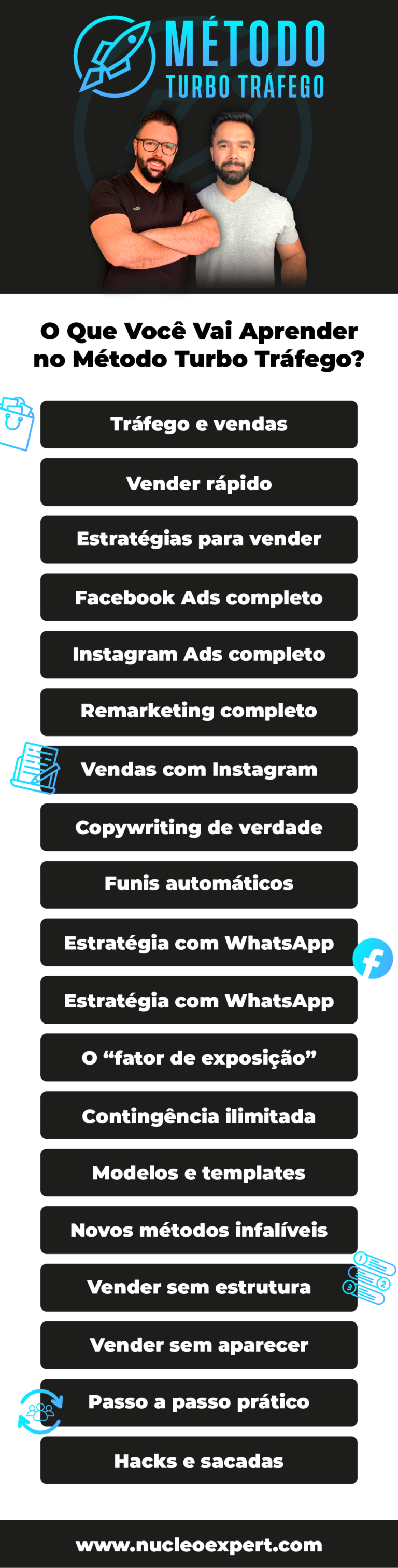 O Método Turbo Tráfego é um curso intensivo focado em estratégias de tráfego pago, criado para fornecer aos participantes as ferramentas necessárias para gerar um fluxo constante e qualificado de visitantes para seus sites e páginas de venda. Idealizado por Alex Vargas, um dos maiores nomes do marketing digital no Brasil, e Douglas Castro, especialista renomado em tráfego pago, o curso combina o melhor das práticas de publicidade online com insights práticos e aplicáveis.